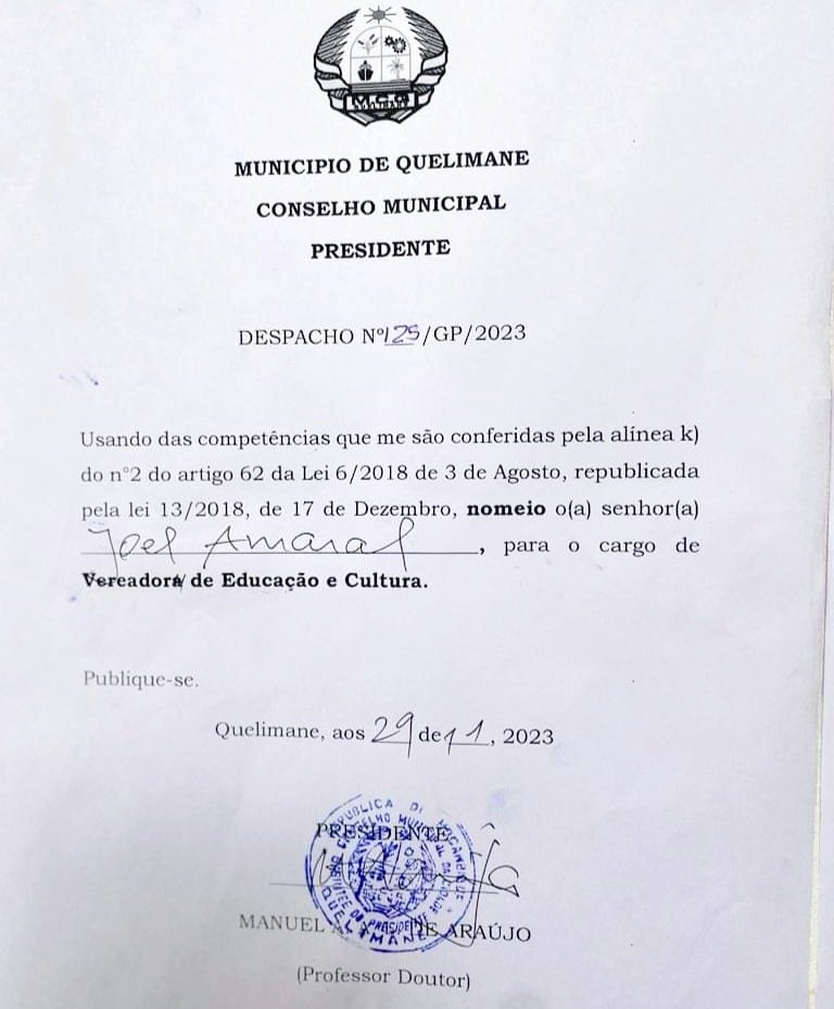 Manuel De Araújo, confirmada a vitória nas eleições de 11 de outubro pelas quais foi reeleito como edil de Quelimane, no uso das suas competências segundo a alínea K, do n˚2 do artigo 62 da Lei 6/2018 de 3 de Agosto, republicada pela Lei 13/2018, de 17 de Dezembro, determinou por despachos da última quarta-feira de novembro passado (29.11), a cessação de alguns vereadores e nomeação de outros na autarquia.